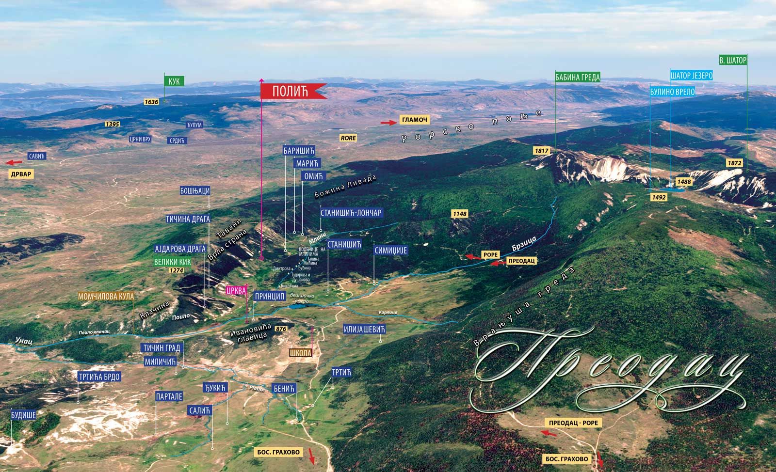 Преодац је једно од десетак села насељених по обронцима Шатора на надморској висини од 860 м. на изворишту реке Унац.